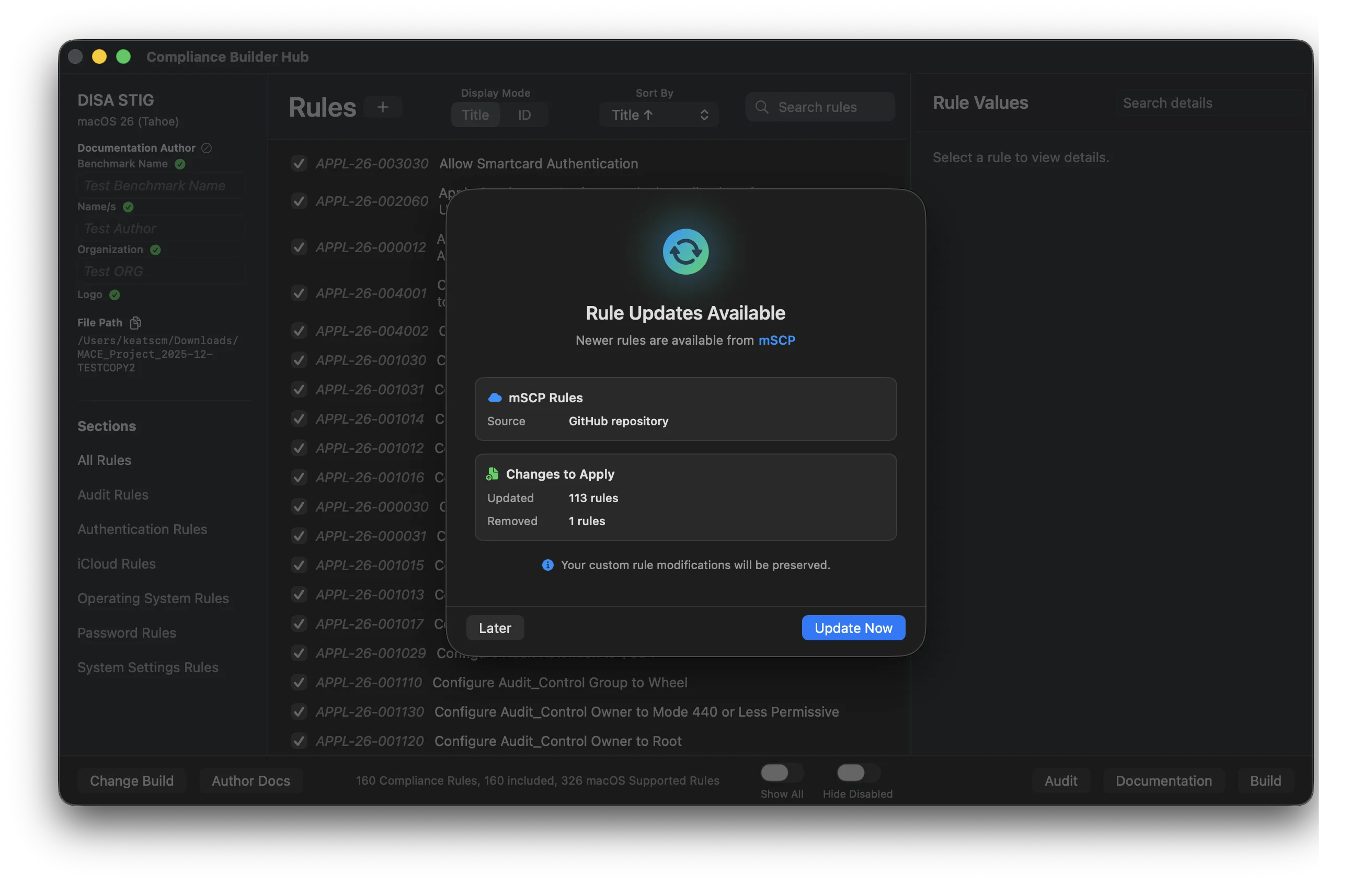 MACE checks your project's rules against the latest mSCP rules from GitHub and notifies you when updates are available. Your custom modifications are always preserved.
