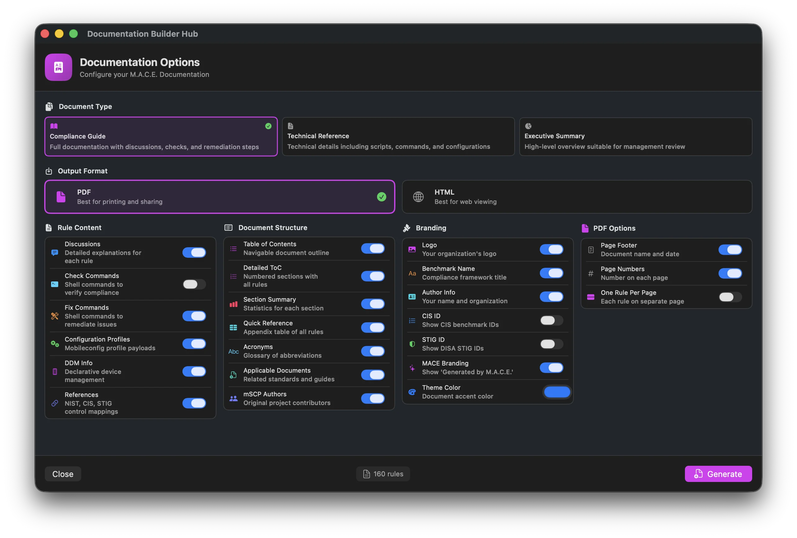 Documentation generates comprehensive guides from your compliance baseline. Instead of manually writing documentation, MACE creates professional documents that include rule details, remediation steps, configuration profiles, and compliance references.