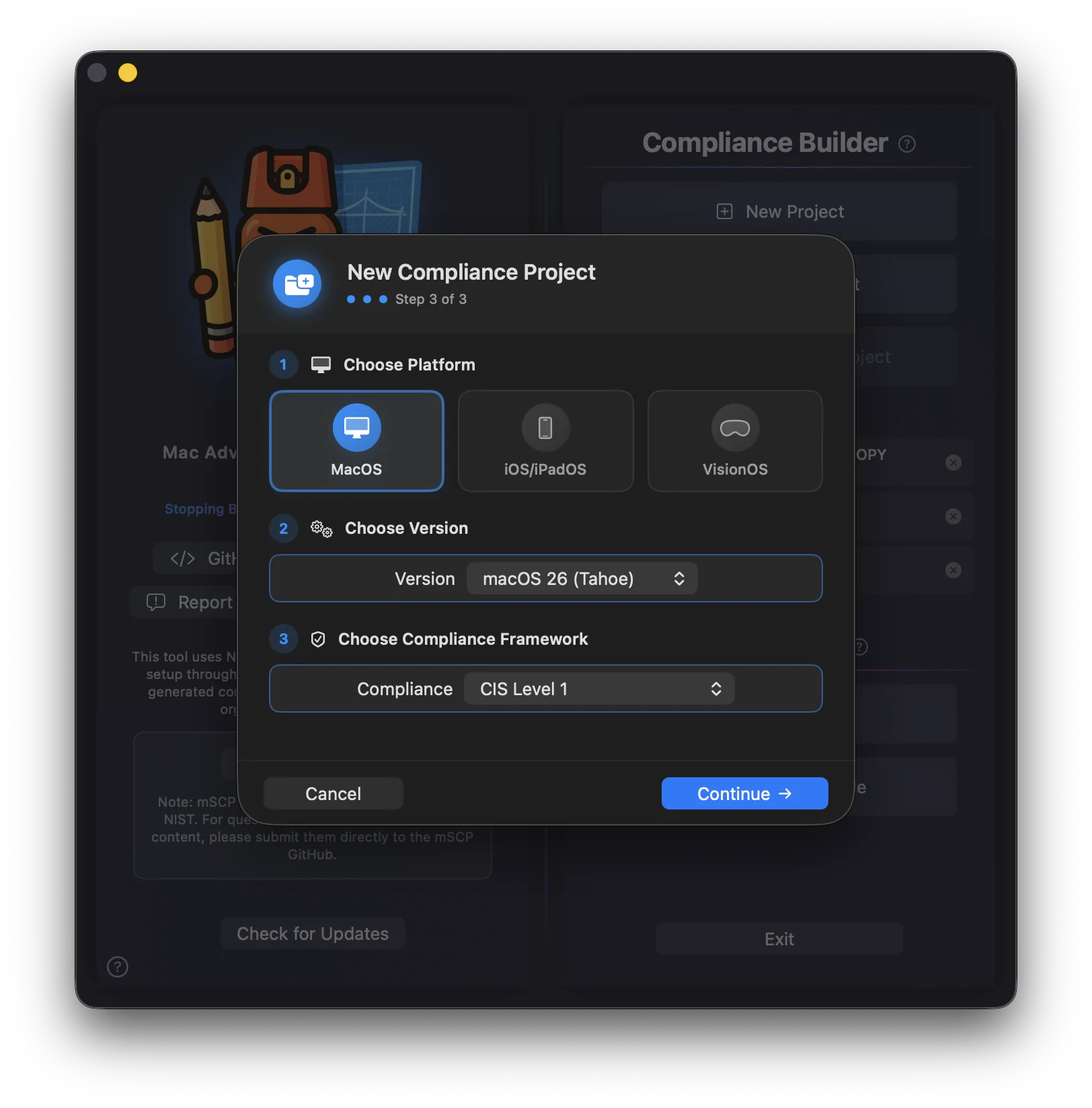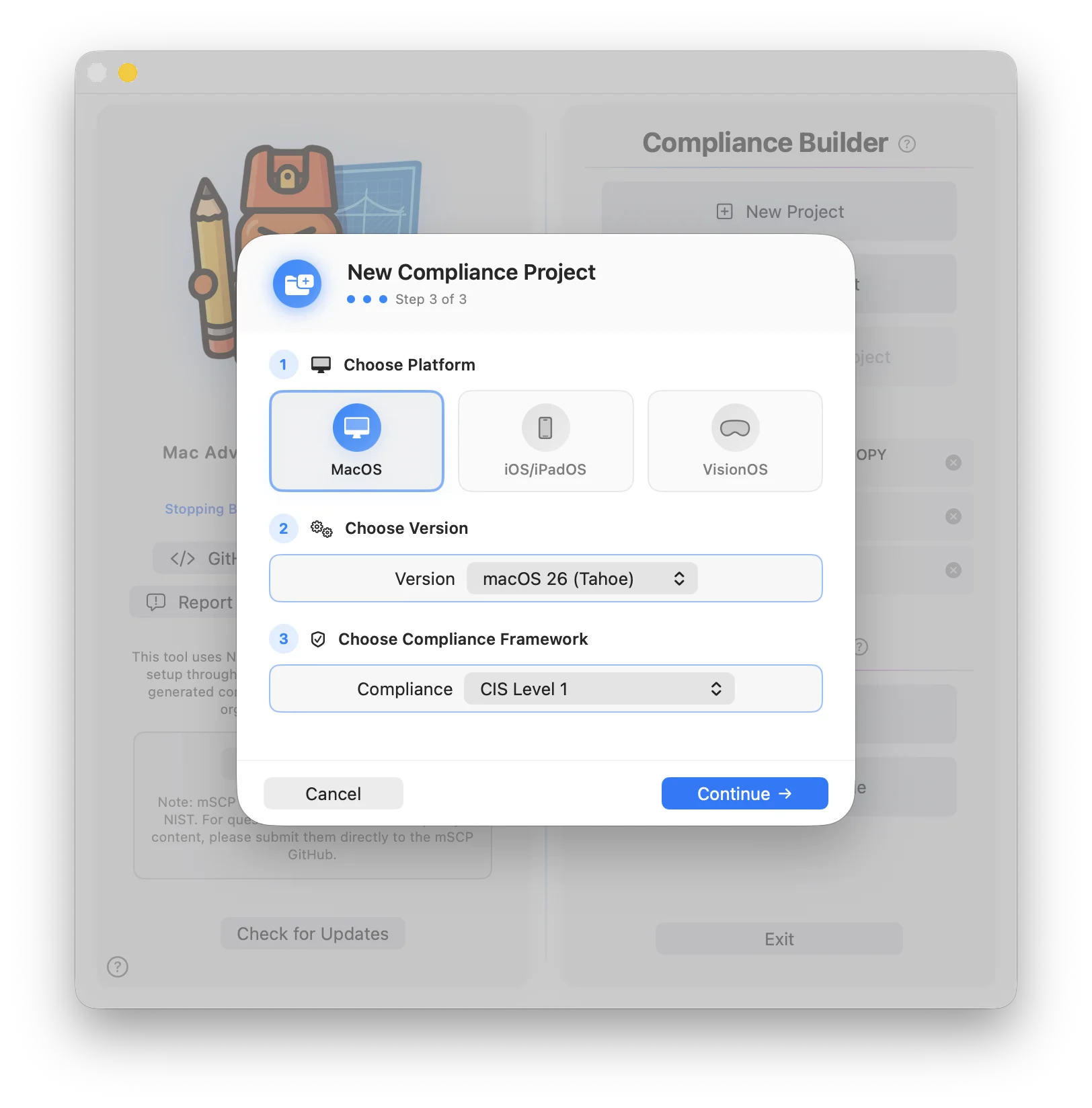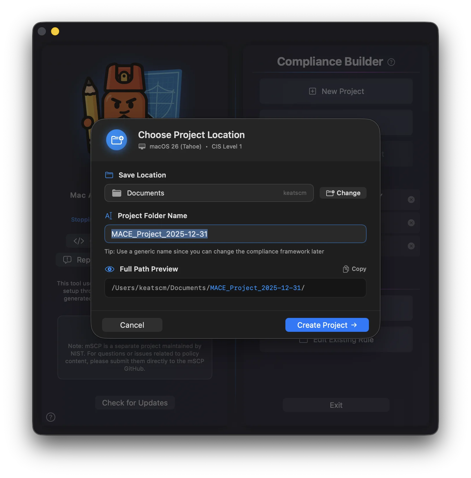 Each project contains your selected framework, customized rules, mSCP files, and everything MACE needs to build deployment-ready outputs.