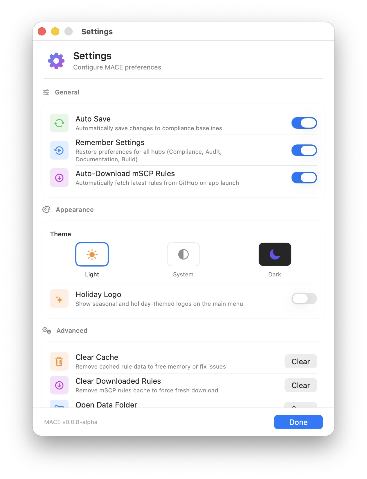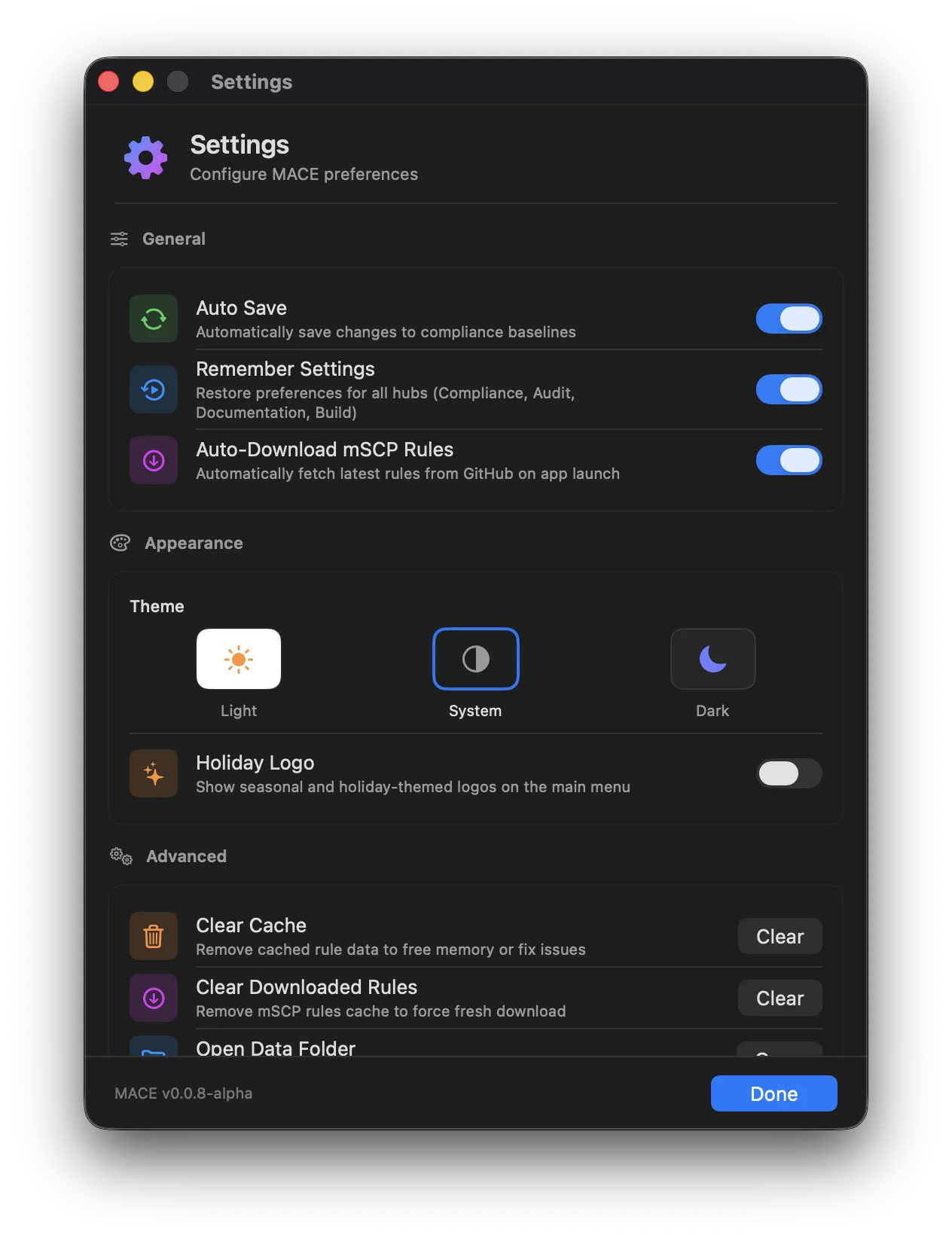 Restore preferences for all hubs (Compliance, Audit, Documentation, Build) when you reopen MACE. Remembers window positions, sidebar widths, and filter states.